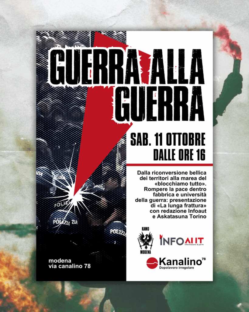 Prima di presentare il testo, una piccola introduzione di riepilogo delle “puntate passate”, per meglio inquadrare il senso dell’iniziativa «Guerra alla guerra» dell’11 ottobre scorso con la redazione di Infoaut e i compagni di Askatasuna Torino. Va premesso infatti che come Kamo non abbiamo pensato questo incontro soltanto in rapporto alle ultime settimane e mesi di mobilitazione per la Palestina e contro la guerra – tempi intensi e convulsi di “aria frizzante”, che hanno visto anche Modena scendere in piazza in massa per la Palestina e in solidarietà con la Global Sumud Flotilla, per fermare il genocidio e “bloccare tutto”, a partire da quella che chiamiamo la «fabbrica della guerra», cioè quell’intreccio di territorio, industria e sapere in ristrutturazione in funzione del riarmo e della guerra, che pone Modena tra i centri dello sviluppo capitalista in trasformazione bellica.