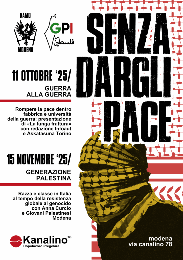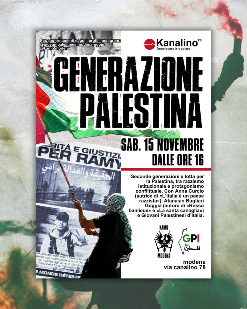 Come queste piazze ed esperienze hanno trasformato le soggettività che si sono mobilitate? Quali le loro genealogie, sedimentazioni e le possibili prospettive di rilancio e trasformazione? Che ruolo hanno razza, classe e religione nella composizione delle lotte presenti e future e nelle forme organizzative politiche del domani? Sono le domande che abbiamo posto e discusso, il 15 novembre 2025 al Dopolavoro Kanalino78, insieme ai Giovani Palestinesi di Modena e Reggio Emilia con Anna Curcio (ricercatrice militante, autrice di «L’Italia è un paese razzista», Derive Approdi 2024) e Atanasio Bugliari Goggia (autore di «Rosso Banlieu» e «La santa canaglia», ombre corte 2022-2023).